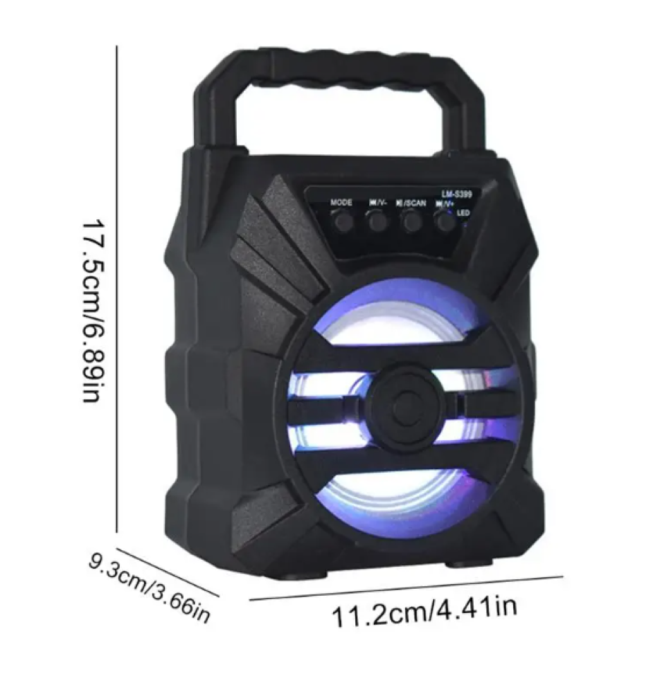 Product Description : Power 5 watts Colorful lights Built-in USB/FM/Bluetooth The tilt sensitivity is 50 dB Battery power 3.7V 500mAh Memory card slot